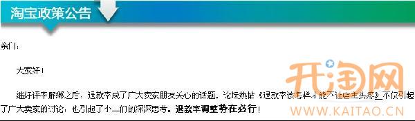 •     11月15日消息,據(jù)開淘網(wǎng)的小編了解,淘寶網(wǎng)已經(jīng)改變退款率的相關政策,退款率不再影響淘寶的搜索排序和營銷活動報名。退款率調(diào)整勢在必行!