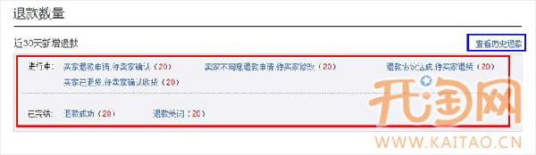 1、紅色框內(nèi)按照退款進(jìn)行中的4種狀態(tài)和已完結(jié)的2種狀態(tài)展示退款狀態(tài)和該狀態(tài)下的數(shù)量。幫助賣家能夠清楚的知道目前該店鋪下的退款狀態(tài)和對(duì)應(yīng)的數(shù)量。