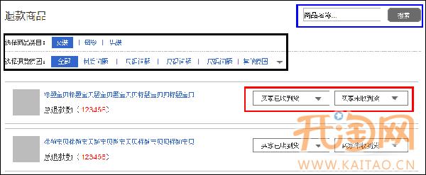 4、藍(lán)色框內(nèi),賣家可根據(jù)單個(gè)商品的商品名稱進(jìn)行搜索。頁面展現(xiàn)該商品標(biāo)題、圖片、退款總量、買家已收到貨和買家未收到貨狀態(tài)下的退款原因和退款成功量。