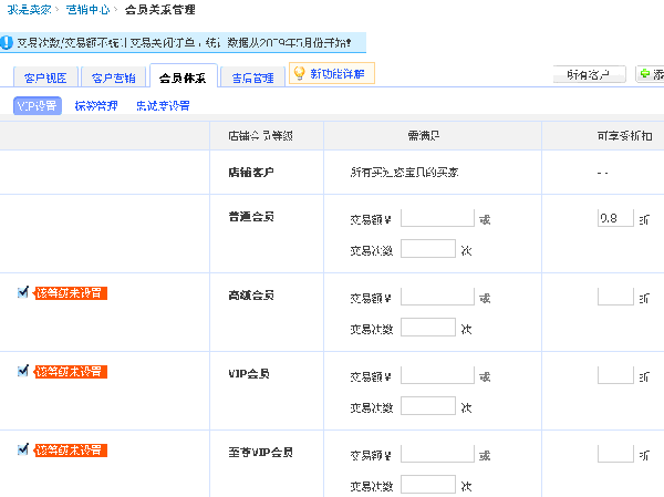 VIP設(shè)置,這是會員關(guān)系管理中最常用的一個功能。當(dāng)?shù)赇佊辛艘欢ǖ臅T基礎(chǔ)的時候,就有必要設(shè)置下不同級別的會員價格,讓不同級別的消費者享受不同的折扣,從而增加消費者的忠誠度。