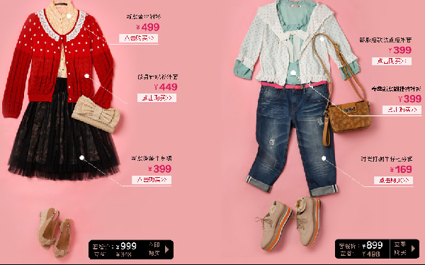 左側(cè),避免與類(lèi)目之間顯得混亂,不適合做太高以及做詳細(xì)搭配的推薦,此時(shí)可以考慮做一個(gè)吸引人的小海報(bào)鏈接至自定義專(zhuān)題頁(yè),通過(guò)自定義專(zhuān)題頁(yè)來(lái)展現(xiàn)各搭配效果。