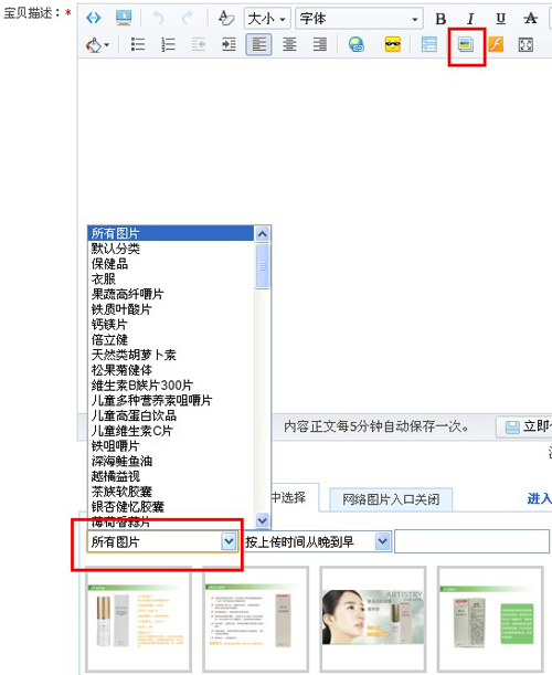 接著是寶貝描述的圖片,在寶貝描述的編輯框,選擇圖中的上傳圖片,會(huì)出現(xiàn)圖片的選項(xiàng),選擇從圖片空間選擇,然后選擇之前上傳圖片的那個(gè)分類,按照順序插入就可以了~~