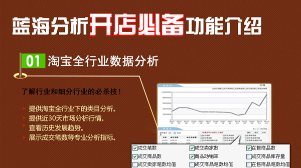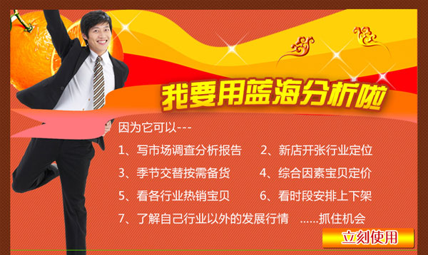 藍海分析團隊為注重數(shù)據(jù)分析的網(wǎng)商開發(fā);提供行業(yè)分析、品牌屬性分析、賣家分析、找熱點行業(yè)等服務(wù);提供功能是您發(fā)現(xiàn)爆款,合理定價,找準上架時間,促銷推廣寶貝及打造爆款的理想輔助工具