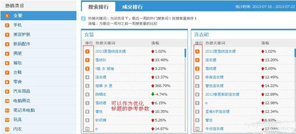 ②進(jìn)入后,左邊20個熱銷類目,右邊是搜索排行近7周的熱搜的關(guān)鍵字(這些關(guān)鍵字可以作為標(biāo)題優(yōu)化的參數(shù))