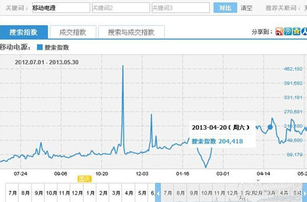 我們還可以將幾個關(guān)鍵詞做一個對比,找出每個關(guān)鍵詞的趨勢分布。在此過程中,小編給大家拿移動電源作為例子,這樣也能讓各位親們更明白些。