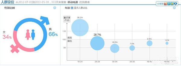 輸入關(guān)鍵字:移動電源,可以看到,淘寶指數(shù)中顯示,“最近七天的搜索指數(shù)環(huán)比3.9%,與去年同期相比337.7%。最近三十天的搜索指數(shù)環(huán)比5.7%,與去年同期相比315.3%。淘寶賣家分析競爭對手的時候,還可以從買家地域分布進(jìn)行分析,如:他們的地理位置、特性,喜歡產(chǎn)品的款式和促銷力度的吸引性等。