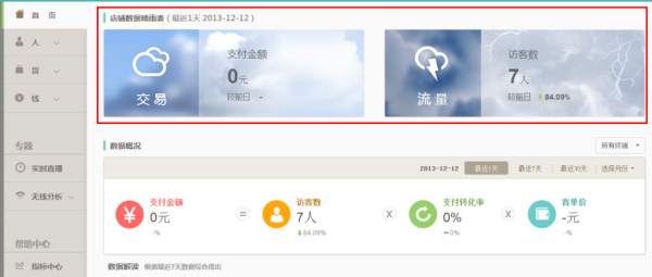 一般來說,店鋪每天要關(guān)注的是兩個結(jié)果數(shù)據(jù):流量和交易,通過生意參謀,我們可以看到首頁的顯示界面如下: