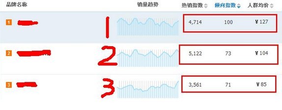 至于產(chǎn)品三的店鋪買家又會怎樣呢?,他們會通過淘寶指數(shù)的數(shù)據(jù)分析,點擊品牌名稱,看到以上兩位產(chǎn)品的圖片風格和那種價格搭配更更合消費人群的需 求,進而提升自己的品牌競爭力。如:品牌一的韓版黑白間條長衫是該店的主打產(chǎn)品,而品牌二的圖片上標著實惠的價格并且包郵,那你作為品牌三的經(jīng)營者,是否就結(jié)合兩家的長處取長補短,運用在自己的產(chǎn)品上呢?