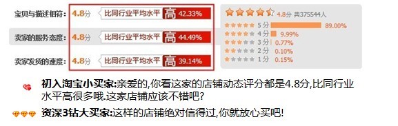 通過以上兩個買家的購物前選擇的對話,相信掌柜們都已經(jīng)很清楚的知道店鋪動態(tài)評分對買家購前選擇的影響是非常大的,那么怎樣做我們才能夠得到和如下這名掌柜這樣高的動態(tài)評分呢?現(xiàn)在,小編就和大家來分享:提升動態(tài)得分的核心三原則