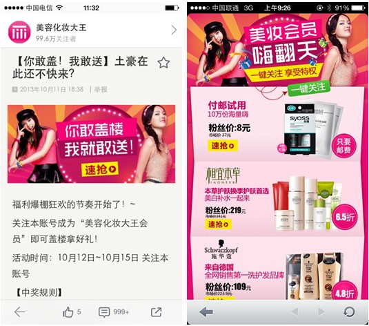 在社交網(wǎng)絡中,玩營銷,就是玩心理。作為天貓最大的化妝品渠道商,麗人麗妝旗下聚集了相宜本草、美寶蓮、施華蔻、蘭芝、H2O等數(shù)十個知名美妝護膚品牌。為了“聚合”這些品牌的力量, 麗人麗妝利用“美容化妝大王”微淘號,聯(lián)合18家品牌旗艦店發(fā)起“一鍵關注 享受特權”的美妝會員嗨翻天活動,并齊集10萬份護膚套裝進行付郵試用的海派,在短短的5天內就給店鋪帶來60萬的粉絲會員和187萬的成交總額。算是除雙十一之外的最好數(shù)據(jù)了。