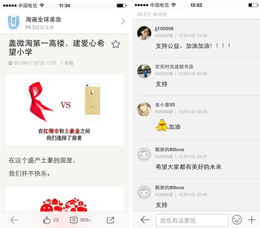 “淘遍全球美妝”在微淘發(fā)起的“蓋微淘第一高樓,建愛心希望小學”的活動廣播,承諾:微淘用戶可以評論回復一起蓋樓,活動結束后,只要這個帖子成為微淘第一高樓,該微淘賬號就出資捐建希望小學?;顒映掷m(xù)了4天,共有45.1萬條愛心評論,最后,該賬號確實成為微淘第一高樓,其也兌現(xiàn)了最初的承諾,在媒體和愛心網(wǎng)友的見證下一起完成了希望小學的簽約儀式。因此,營銷方法無論是對微淘平臺,還是對該商家而言,都是一次正能量的公益創(chuàng)新玩法。