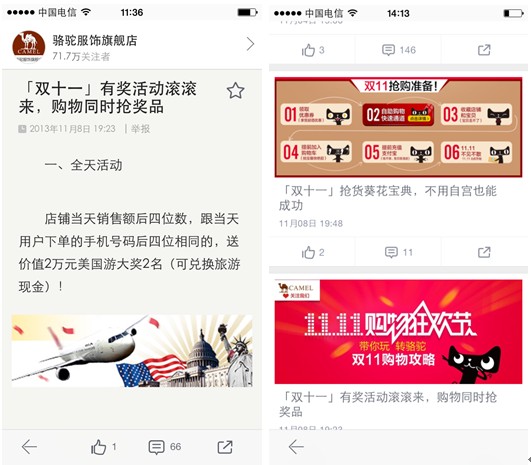 縱觀2013年的雙十一,龐大的成交金額數(shù)字自然是亮點,但更具有亮點的還是商家的無線成交額。其中,論戰(zhàn)略和戰(zhàn)術結合得最出色的商家非 “駱駝服飾”莫屬了,無線銷售額比去年翻了兩番,突破2170萬元。成為2013年無線成交冠軍的,“借力微淘做大促前的預熱和大促當天的精準營銷?!边@是駱駝服飾的成功秘訣。