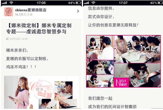 說到如何讓商家快速找到消費端用戶的需求,并且保證消費端用戶一定程度的穩(wěn)定性這一難題,做得最成功的當數(shù)淘品牌女裝“夏娜了。在微淘,“夏娜”推出【投票選款】活動,讓粉絲通過微淘投票選出一個受歡迎的款式,嘗試性的放在天貓店鋪,結果受到歡迎,短短一天就銷售了2000多件。在此種玩法的基礎上,夏娜又推出了“娜米微定制”,讓粉絲參與到商品的設計環(huán)節(jié)中。并承諾會隨機抽取一位設計智囊團員,第一時間奉上專屬定制款美衣。經(jīng)過和夏娜本身風格定位的匹配以及設計需求的明確度考量,最終納入考慮的設計圖約為80份左右。這一切的活動,只需要通過微淘發(fā)布一條廣播就可輕松實現(xiàn)了。
