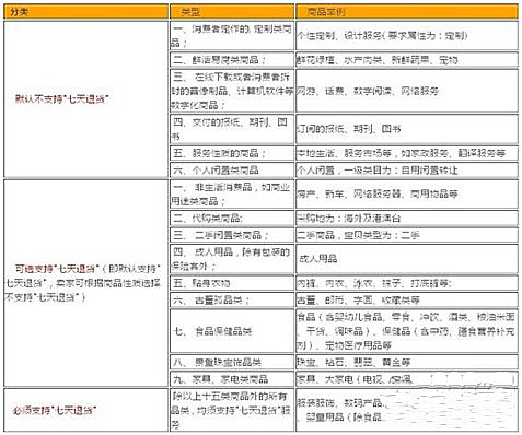 當中的七天無理由退換貨,是淘寶網(wǎng)將商品劃分為三類:默認不支持“七天退貨”、可選支持“七天退貨”和必須支持“七天退貨”。除特殊規(guī)定的15類商品,其他品類的商品都必須支持七天退貨服務。商品分類的詳細情況請看下圖。