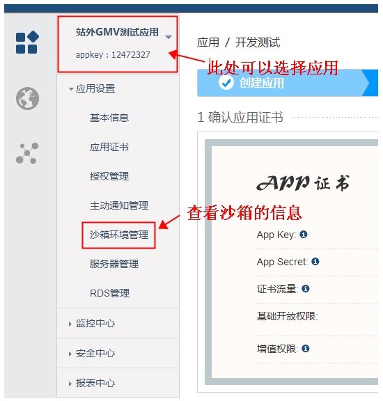 創(chuàng)建應(yīng)用完成后,就進入到開發(fā)測試??梢韵冗x擇配置:“沙箱環(huán)境管理”,開發(fā)者可以在沙箱環(huán)境中完全仿真的測試TOP接口的功能
