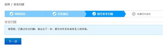 通過安全掃描后,就可以點擊下一步,完成申請發(fā)布應(yīng)用。用戶可以選擇對外發(fā)布或者是上線申請。