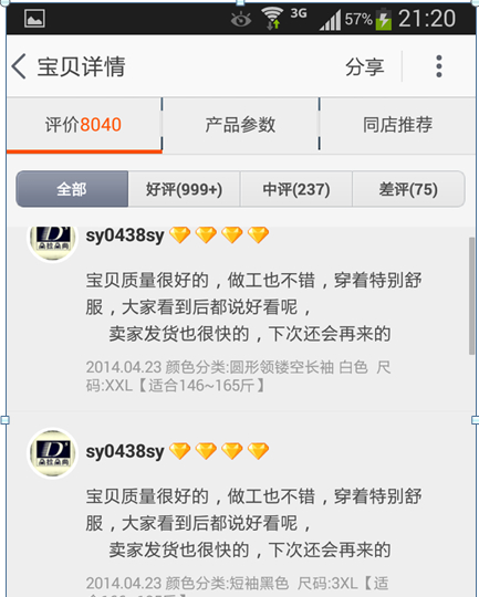 手機(jī)淘寶在寶貝詳情的第一頁(yè)只是展示了一個(gè)評(píng)價(jià),這個(gè)評(píng)價(jià)是一個(gè)關(guān)鍵,很多顧客為了節(jié)省流量,直接就看這么一個(gè)評(píng)價(jià)的!所以,能靠在排名第一的評(píng)價(jià)一定要做好,要素:顧客的旺旺級(jí)別、產(chǎn)品的相關(guān)性、物流的相關(guān)性、客服的服務(wù)態(tài)度。