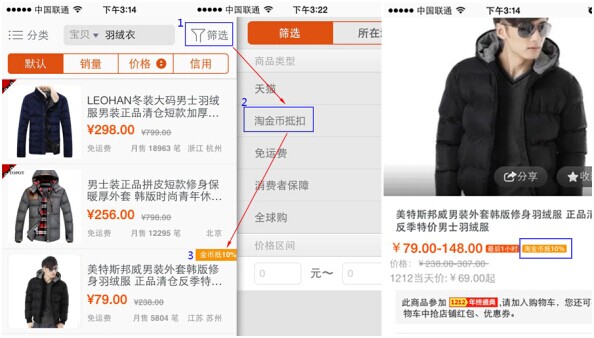 1、無線:在最新版淘寶客戶端,淘金幣寶貝有特殊標(biāo)志+專項篩選