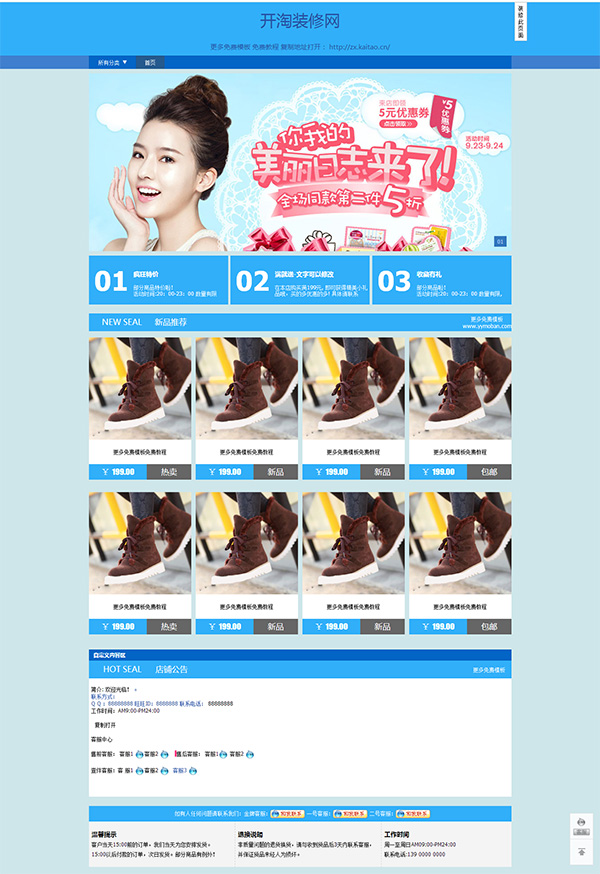 下面,開淘裝修小編給大家分享一款藍(lán)色化妝品美容模板其他行業(yè)通用模版專業(yè)版。效果圖如下: