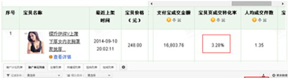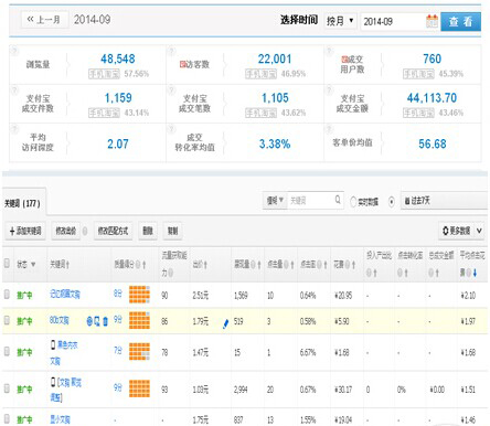 分析:這個(gè)內(nèi)衣店鋪整體點(diǎn)擊轉(zhuǎn)化率是3.38%,客單價(jià)均值56.68,流量?jī)r(jià)值=客單價(jià)均值56.68*成交商品數(shù)3.38件/100個(gè)有效流量=1.91元。若淘寶直通車的每個(gè)有效流量可以達(dá)到1.91的PPC,那么,智通策好ROI將維持在1:1的狀態(tài)下。這我們參考此數(shù)據(jù),控制關(guān)鍵詞的平均點(diǎn)擊花費(fèi)。