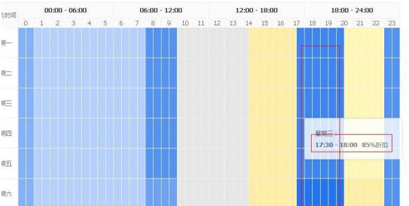(2)調(diào)整分時(shí)折扣:通過(guò)分時(shí)折扣控制整體的推廣力度,記錄分時(shí)折扣的打折力度,算出關(guān)鍵詞大概降了多少錢(qián),這樣可以把省出來(lái)的錢(qián)加權(quán)到移動(dòng)端。如下圖,在周三的17:30--18:00有85%的折扣。