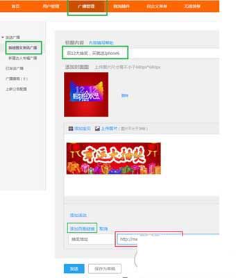 3、進(jìn)入無(wú)線端店鋪,找到廣播管理,然后把廣播鏈接添加到頁(yè)面鏈接,然后把抽獎(jiǎng)鏈接放到綠色選框內(nèi),隨便一個(gè)就行,這樣我們就能得到抽獎(jiǎng)地址了。