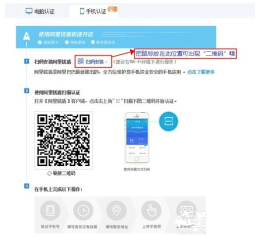 步驟一:下載阿里錢盾。把鼠標(biāo)移向“掃碼安裝”會出現(xiàn)下面這樣的提示,根據(jù)手機系統(tǒng)選擇安裝“阿里錢盾”。