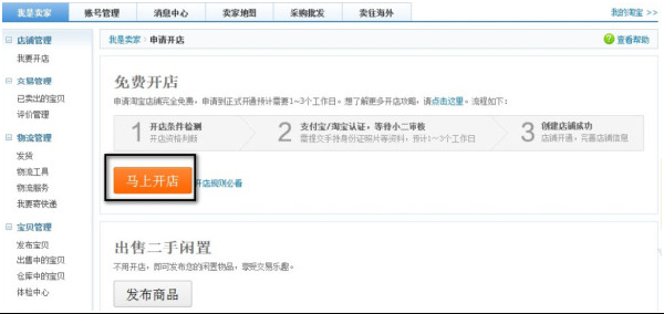 1、在入口點(diǎn)處進(jìn)入到開店頁(yè)面,點(diǎn)擊“馬上開店”一項(xiàng)。
