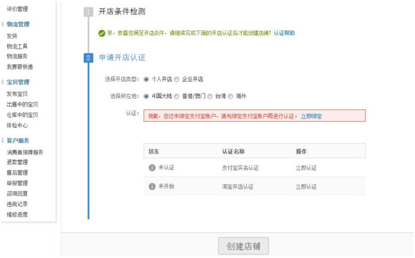 3、當(dāng)所有開店條件檢測(cè)都通過(guò)了后,則需要完成支付寶賬號(hào)綁定,并且申請(qǐng)支付寶實(shí)名認(rèn)證和開店認(rèn)證。當(dāng)所有認(rèn)證都通過(guò)了后,才可以點(diǎn)擊創(chuàng)建店鋪。