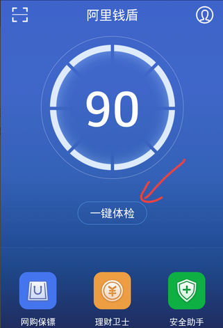 1.下載安裝阿里錢盾,進(jìn)入阿里錢盾頁面,在頁面中會有“一鍵體檢”,這個是對手機(jī)進(jìn)行掃描,看看是否存在風(fēng)險的。