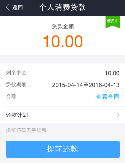 我們?cè)凇百J款記錄”中可以看到個(gè)人的消費(fèi)貸款,這里我們可以選擇“提前還款”