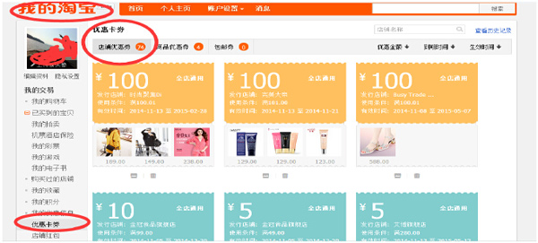 位置2、在“我的淘寶”——找到“優(yōu)惠卡卷”并點(diǎn)擊——在“店鋪優(yōu)惠劵”一項(xiàng)下可看到。