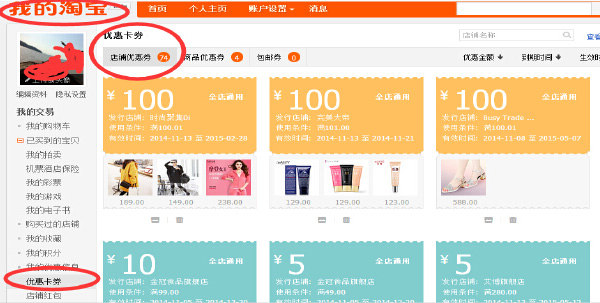 二、我的淘寶——我的交易——優(yōu)惠卡券——店鋪優(yōu)惠券