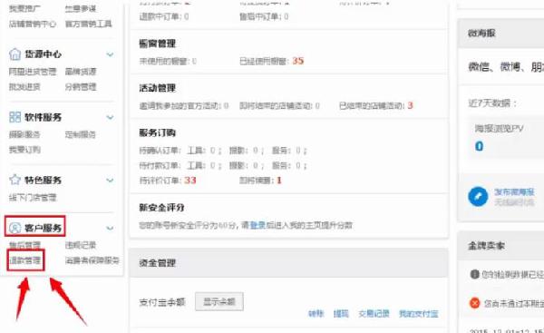 1、首先登錄淘寶中心后臺(tái),找到左側(cè)菜單欄中客戶服務(wù)管理,點(diǎn)擊客戶服務(wù)中的退款管理,如圖所示