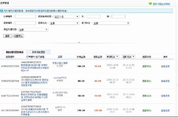 2、點(diǎn)擊“退款管理”進(jìn)入如下所示頁面,包括退款訂單編號(hào)查詢以及我申請(qǐng)到的退款