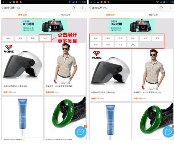 一、在免費(fèi)試用欄目下,點(diǎn)擊展開更多類目,您可以按照喜歡的搜索相關(guān)試用品,也可以選擇不按類目查找,一頁頁翻看全部試用品。