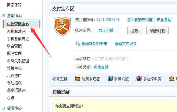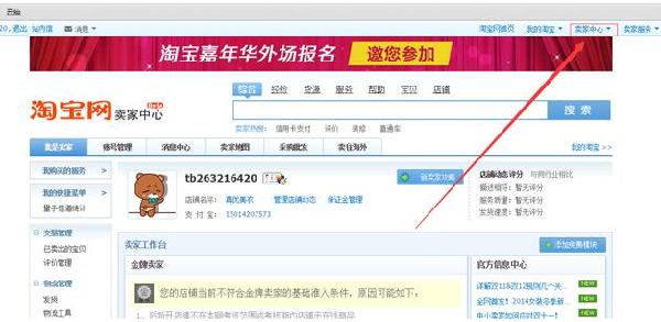 一、首先登陸淘寶賬號(hào),點(diǎn)擊屏幕上方的【賣家中心】,在左邊菜單欄找到【淘寶營(yíng)銷中心】點(diǎn)擊進(jìn)入
