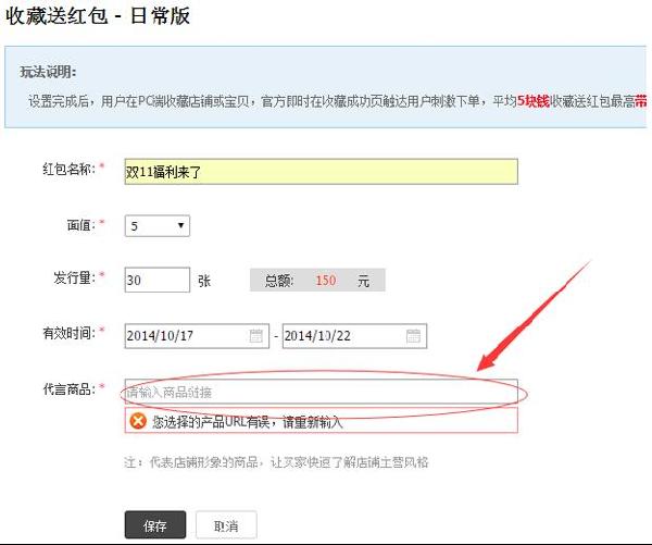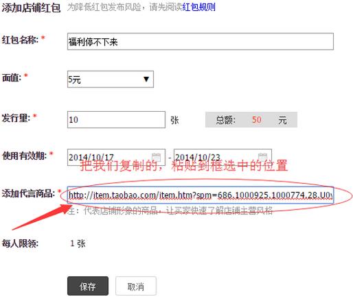 十四、接著我們回到“填寫收藏店鋪紅包的內(nèi)容界面”,把鏈接“粘貼到這個(gè)位置,點(diǎn)擊保存。