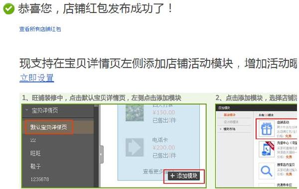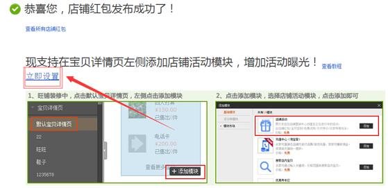 十七、但我們還要把這個(gè)活動(dòng)放進(jìn)我們的詳情頁里面,讓每個(gè)客戶能夠看到我們的“收藏店鋪送紅包”并且去領(lǐng)取它,當(dāng)然要怎么放呢?在哪里放呢?看到“立即設(shè)置”按鈕,點(diǎn)擊。