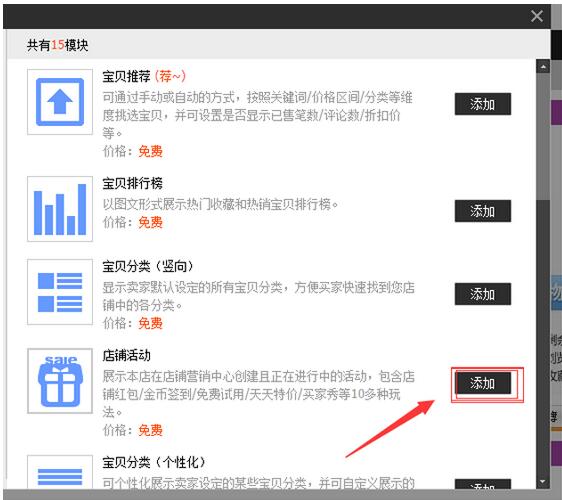 十九、點(diǎn)擊后看到了模塊頁面,里面有很多模塊供我們選擇,這個(gè)時(shí)候我們選擇“店鋪活動(dòng)”他的右側(cè)有一個(gè)“添加”按鈕點(diǎn)擊添加。