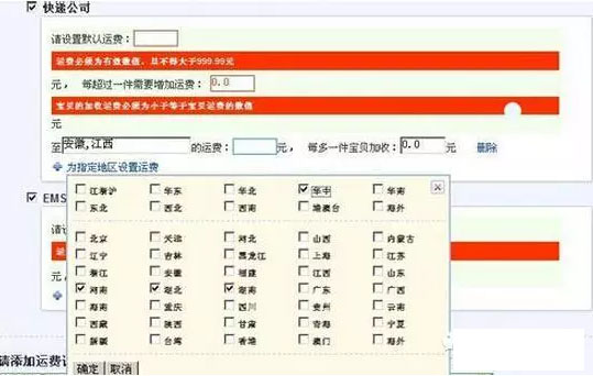 因?yàn)榭爝f費(fèi)也是按地區(qū)、距離來收費(fèi)的,所以我們可以給每個(gè)不同地區(qū)設(shè)置不同的運(yùn)費(fèi)價(jià)格。點(diǎn)擊“為指定地區(qū)設(shè)置運(yùn)費(fèi)”就會(huì)彈出地區(qū)選擇框,然后勾選你要設(shè)置的地區(qū),點(diǎn)擊“確定”。最后填上價(jià)格即可。