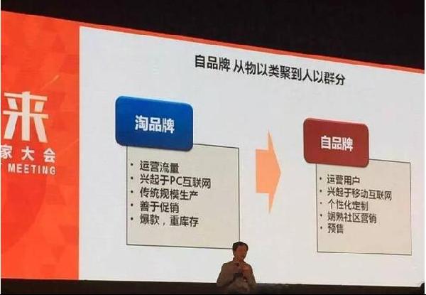 楊過指出,淘寶正在經(jīng)歷從淘品牌到自品牌的進化。他說,淘品牌興起于PC互聯(lián)網(wǎng),運營的是流量,重視傳統(tǒng)規(guī)模生產(chǎn),善于促銷,銷售爆款,重庫存;自品牌興起于移動互聯(lián)網(wǎng),運營的是用戶,生產(chǎn)模式是個性化定制,采用社區(qū)營銷,通過預(yù)售減輕庫存壓力。