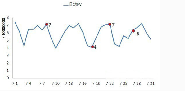 上圖是淘寶首頁(yè)焦點(diǎn)圖2焦~4焦各輪可競(jìng)價(jià)日均PV流量趨勢(shì)圖。