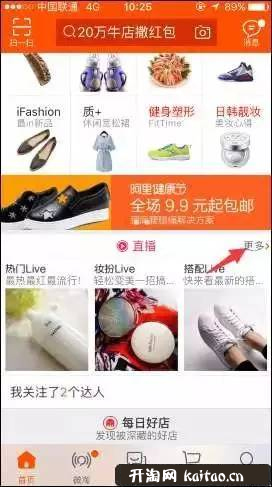 1、打開(kāi)淘寶客戶(hù)端,在最下方找到淘寶直播,點(diǎn)擊更多進(jìn)入,如圖;