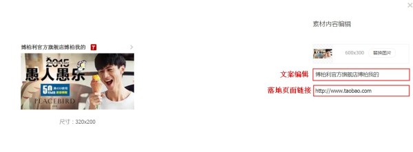 進(jìn)行文案編輯、落地頁面鏈接填寫即可(注:無線端落地頁面鏈接只能是店鋪或單品,活動頁面鏈接暫時(shí)不支持,系統(tǒng)會自動將鏈接轉(zhuǎn)化為無線端的鏈接)