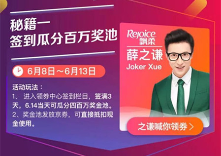 1、打開京東APP,進(jìn)入領(lǐng)券中心簽到欄目,簽滿3天,6月14日當(dāng)天瓜分四百萬(wàn)獎(jiǎng)金池;