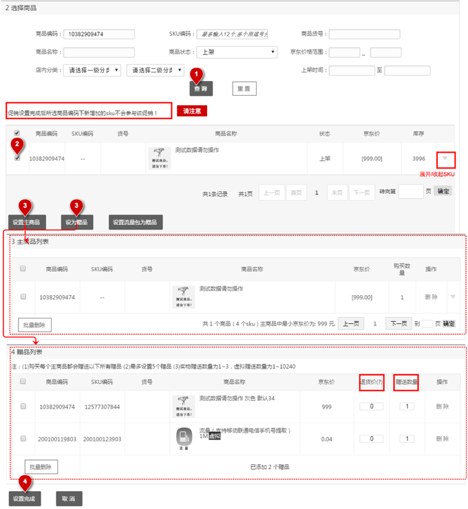設(shè)置主商品和贈品是在一個頁面內(nèi)完成,按以下順序完成商品選擇。