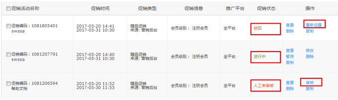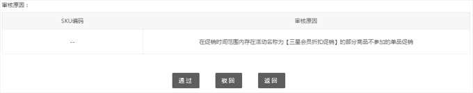 情形二: 當(dāng)活動促銷狀態(tài)顯示人工未審核,這時需要點擊審核按鈕,進(jìn)入詳情頁進(jìn)行進(jìn)一步處理操作。這一步的目的是為了避免因優(yōu)惠疊加后造成部分商品售價過低等風(fēng)險,給您造成損失。