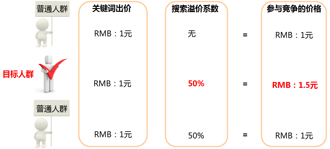 搜索溢價是在單元級別的關(guān)鍵詞上的一種定向功能。引用DMP中的人群包來圈定營銷人群,對每個人群包設(shè)置溢價系數(shù)。當(dāng)用戶發(fā)起搜索匹配到推廣結(jié)果時,假如用戶命中了廣告主設(shè)置的某個人群,獲取該人群的溢價比例(假設(shè)X%),并用關(guān)鍵詞出價*(1+X%)去參與競價,可以提升廣告露出的概率,并獲得更高的點擊與轉(zhuǎn)化效果。
