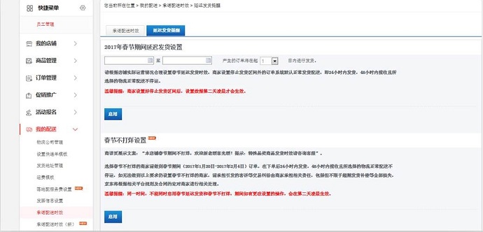 A:進(jìn)入商家后臺(tái)>我的配送>承諾配送時(shí)效>延遲發(fā)貨提醒,設(shè)置“2018年春節(jié)期間延遲發(fā)貨設(shè)置”或者勾選“春節(jié)不打烊設(shè)置”(只能選其一),設(shè)置時(shí)請(qǐng)仔細(xì)閱讀設(shè)置頁(yè)面上的提示內(nèi)容,設(shè)置完成后點(diǎn)擊“啟用”按鈕開(kāi)啟相應(yīng)功能。啟用后如需更改所設(shè)置內(nèi)容,可點(diǎn)擊“重置”按鈕后進(jìn)行重新設(shè)置,設(shè)置完畢后點(diǎn)擊“修改”按鈕重新開(kāi)啟; 也可直接更改原設(shè)置,更改后點(diǎn)擊“修改”按鈕重新開(kāi)啟。啟用后如需停用所設(shè)置的內(nèi)容,可直接點(diǎn)擊“停用”按鈕。